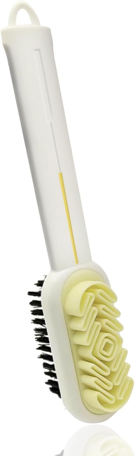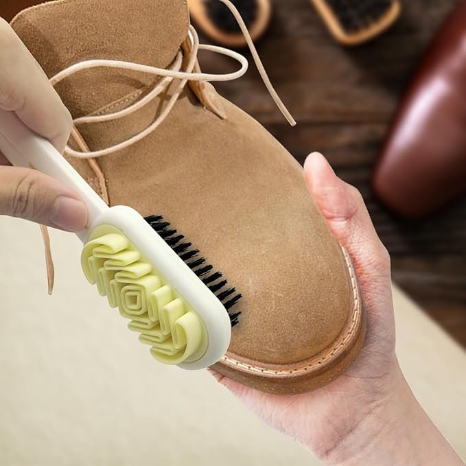 - Double Sided Soft Bristles Design: The silicone shoe brush has two different sides: the rubber side of the folded crepe design for you to gently and easily raise the nap and collect the dirt from the suede, for cleaning the leather suede, sanded leather, turned fur items, and the bristle side can brush most kinds of shoes, not worry about hurting shoes